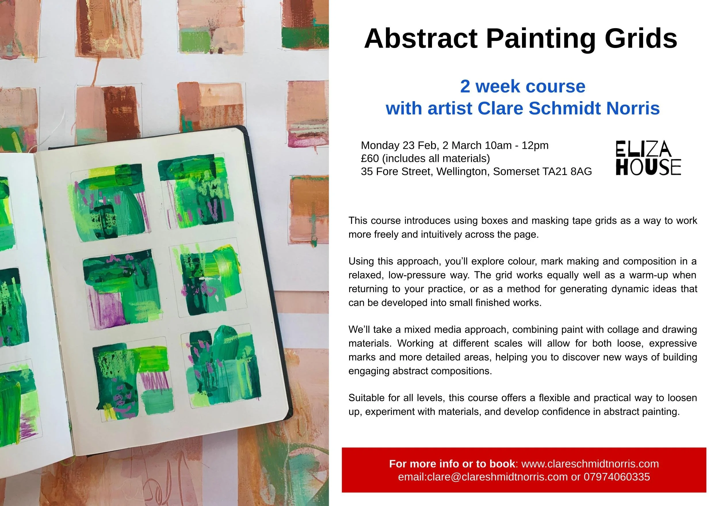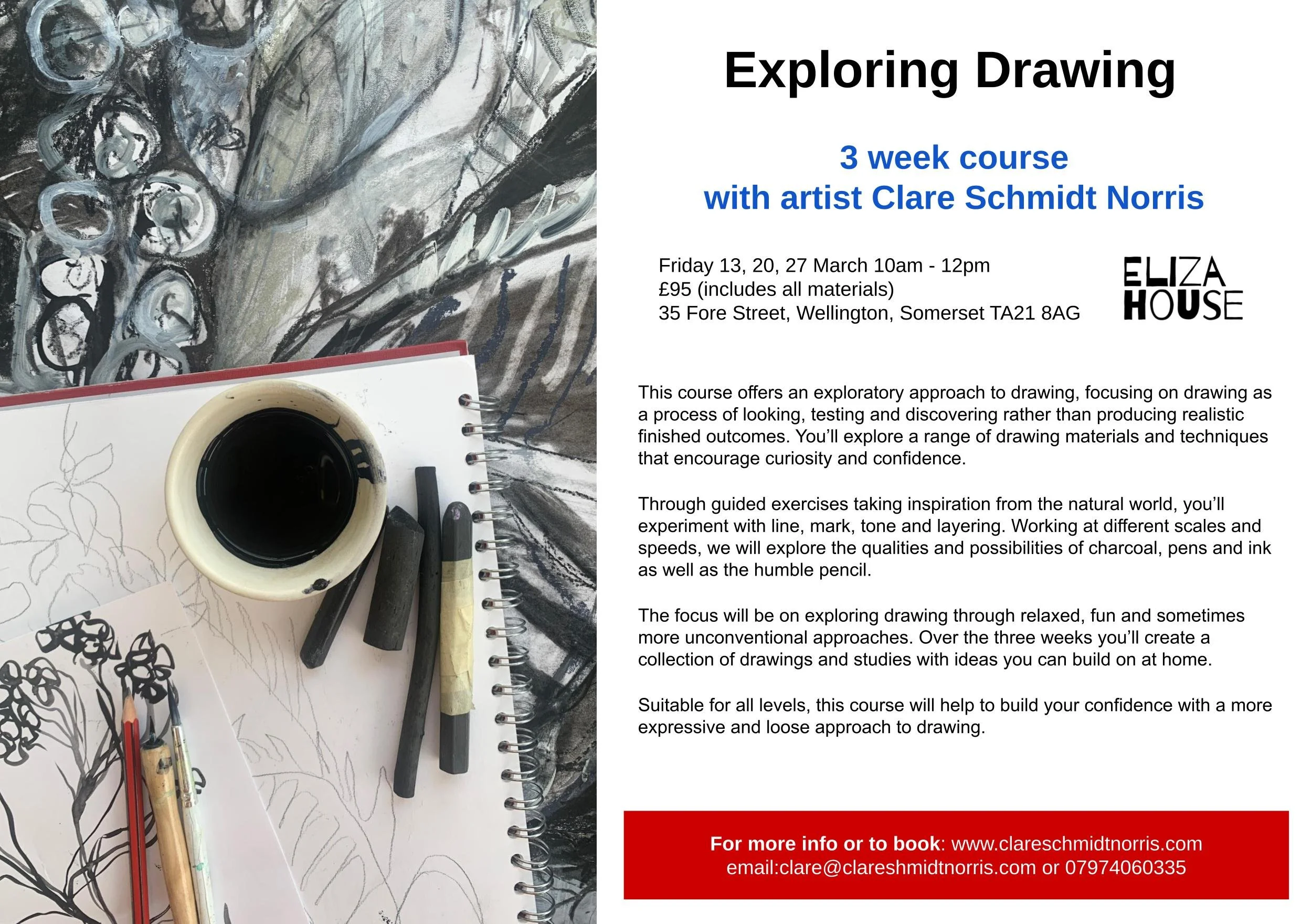 Most courses will run at Eliza House in Wellington. The first floor art studio in this beautiful period house has all the equipment and materials you will need for the course and is easily accessible with public parking next door.